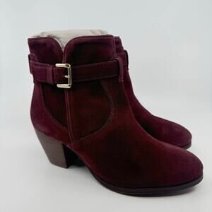 These Diba burgundy ankle booties in women's size US 7.5 feature a sleek buckle design, side zipper, and a block heel for added style and comfort. Perfect for elevating any look with their chic, modern appeal.