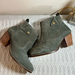 Diba Sophia Green Suede Ankle Boots. Size 7.5, 2 1/2” heel. Side Zipper.