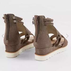 Everyday is a lucky day when you wear GREEN CLOVER. This 2- inch platform wedge sandal is covered in embossed leather/ embossed suede snakeskin. The intricate cut- out design detail and elastic ankle wrap adds a stylish accent and bohemian flair. A padded insole offers comfort without compromising style. An easy back zip closure and open toe adds a relaxed finish to any outfit.