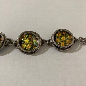 This bracelet features four round dichroic glass elements set in metal frames, offering a unique and artistic touch to any ensemble.