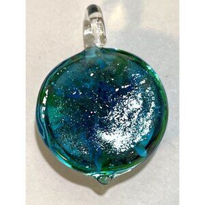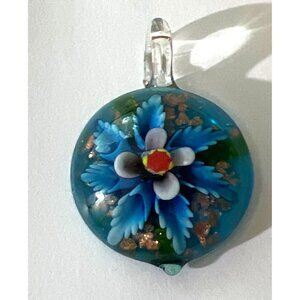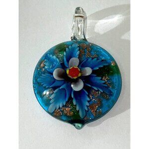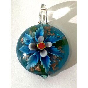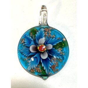 Dichroic Glass Blue Flower Pendant -- Small. A unique white and blue flower dichroic glass pendant. Will arrive to you in excellent pre-loved condition. The flower in the glass has great detail placed over gold glitter on a black glass background. Measurement: 1.5"x1.5"