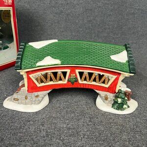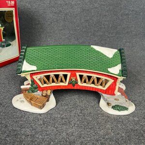 This charming 1998 porcelain covered bridge from Dickens Collectibles adds a nostalgic touch to any holiday village. Perfect for collectors and enthusiasts, it comes with its original box for safe storage and display.