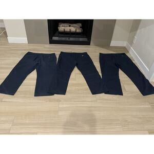 This lot of three Dickies 874 Original Fit Work Pants are perfect for any occasion, whether it be for travel, casual wear, or workwear. The pants are made of a comfortable and durable polyester and cotton twill fabric, with a solid navy blue color and slash pockets. They feature a flat front and straight leg style, with a mid-rise of 10-12 inches and a waist size of 44 inches. The pants have a zip and hook & eye closure, with accents including a zipper and logo.