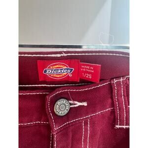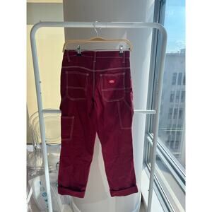 Dickies work pants. Burgundy. Straight leg, relaxed fit. White contrast stitching. Can roll the cuffs. Durable fabric, classic workwear vibe. Good for casual looks or actual work. Probably comfortable after a few washes.