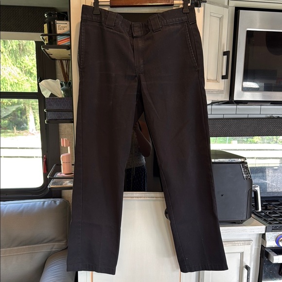 Classic black Dickies straight-leg slim strait pants. Perfect for any occasion. These are worn in with imperfections however I like the worn in look on this brand. See pictures for wear and tear.