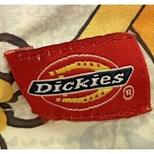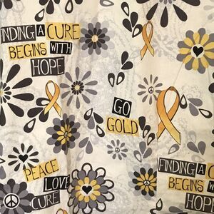 Dickies Cancer Cure Top. Women's size Large, Fitted, White Multicolor White, Black & Gold, Floral, 97% Cotton - 3% Spandex, 2 Pockets, V-Neck Scrubs. Black Piping on Neck, Dickies Logo on Sleeve. Scrubs for Nurse, Vet, Dental, Medical.