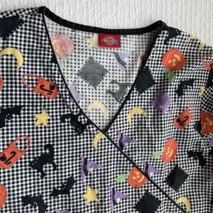 Dickies Checkered Halloween Scrub Top M Festive Pumpkins Black Cats Moon Stars