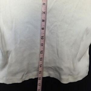 Dickies White Ribbed Cropped. This short-sleeved top features a v-neckline, button-front closure, and a Dickies logo. It's a versatile piece perfect for a casual, streetwear, or Y2K-inspired look.