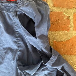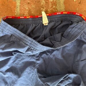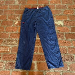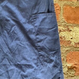 Full elastic blue scrub pant. Double cargo pockets on right side single deep cargo pocket on left side. All navy with red trimming and back the famous Dickies logo is on the two cargo pockets on the right side. Dickies scrubs pants in a classic blue color are designed for both functionality. Crafted with durable materials, they offer a comfortable fit and a versatile look, making them ideal for everyday wear. Approximate measurements in photos. One knee has wear and a small hole.