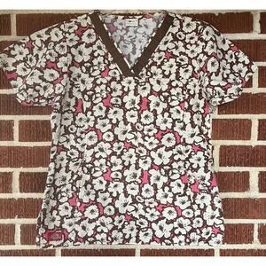 This Dickies scrub top is a beautiful addition to any medical professional's wardrobe. The floral pattern adds a touch of color and cheer to the workday. Made from comfortable cotton material, the top is designed for women and comes in size XS.