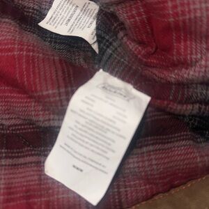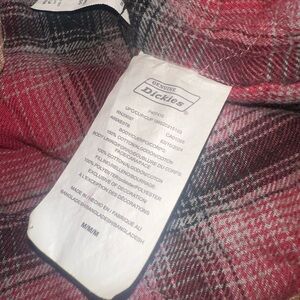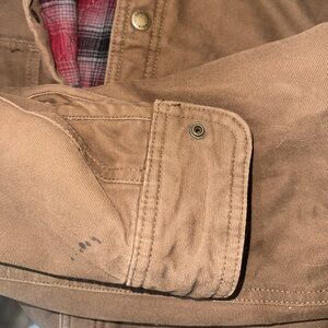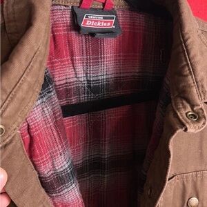 Classic Dickies canvas work jacket with warm red plaid flannel lining. Heavyweight duck canvas with snap button front and chest pockets. Great everyday workwear or streetwear layering piece.