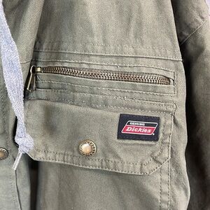 Dickies Men's Green 2XL Full-Zip & Snap Quilted Lined Hooded Jacket Distressed under left arm, torn at the same felt hood . Fair used condition, see pictures for details.