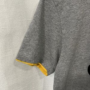 This Dickies Men's T-shirt is in size LARGE and features a gray color with a graphic logo on the front and yellow trim on sleeves and hem. It has a crew neck and short sleeves, making it a classic and breathable choice for the summer and spring seasons. The garment is machine washable and easy to care for, maintaining its regular fit and comfortable wear. Perfect for casual wear, this T-shirt showcases the Dickies brand with a touch of logo accents.