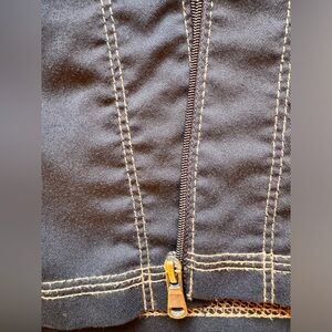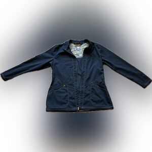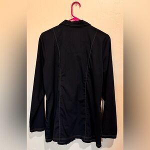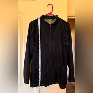 Dickies black scrub jacket. Zipper down, front pockets. Quality stitching in gold color. Worn once, well cared for. Smoke and dander free environment. Can be worn with scrubs or would complement any outfit.