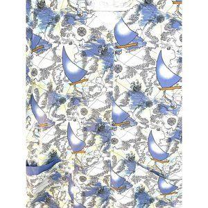 This top is in excellent condition with no stains or damage. There are sailboats on a background of ocean maps with islands, sailing ships & compass's The top is white with shades of light blue & pale yellow & has an adjustable tie at the back waist. The care tag inside is too worn to read but the fabric feels like cotton blend.