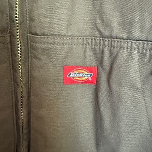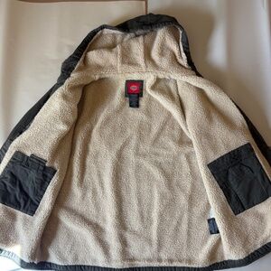 Dickies Cold Weather Sherpa Jacket with Hood in Slate- front zipper closure, long sleeves. Exterior jacket 100% Cotton. All front pockets have fleece lining. One front zip pocket. Two lower front slide in pockets with a Dickies logo patch. Sleeve wrist has snap closure which brings it closer to the hidden inner stretchy cuff band.