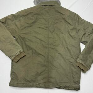Heavy-duty Dickies canvas work jacket in olive green with quilted inner lining and cozy sherpa-lined hood. Features dual chest pockets (one with zipper), button closure, and warm insulated interior. Tagged size XL (46–48). Has light signs of wear but in great functional condition.