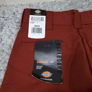Men's Dickies Skateboarding Regular Fit straight leg twill pants in orange-red "fired brick". Style number wpsk96ik9. Polyester/cotton blend. New with tags, but has a couple marks on the back as shown in photo. Men's size 28x30, real measurements shown in photos with pants laid flat: