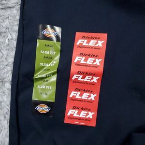 Men's Dickies Slim Fit Tapered leg flex Twill Work Pants in dark blue. New with tags. Men's size 34x30, real measurements shown in photos with pants laid flat: