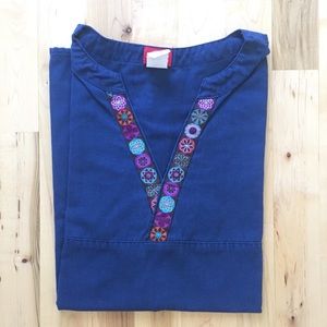 Navy scrub top with cute ribbon like detail at the neck. Wear with any color scrub bottoms. Two pockets. Used with lots of life left!