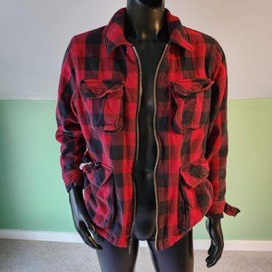 Dickies vintage, well-loved large heavy zippered work shirt/shacket. Red & black plaid checker pattern. Fleece interior. Snap pockets. Lower front right pocket shows some wear--see photo. This shirt has a story to tell...won't you continue it?