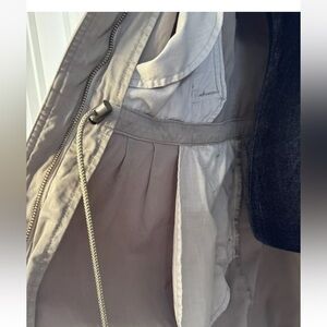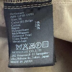 This unique Dictionary utility parka is a must-have for any fashion-forward woman. Made in Japan, this Y2K-inspired jacket features a solid beige color with ruffle accents and a drawstring closure. The long sleeves and mid-length design make it perfect for winter, fall, and spring seasons. The jacket has a relaxed fit and is made from a blend of cotton, rayon, and polyurethane materials. It also has pockets and a crest beading design, adding a touch of utility and preppy style. This parka is perfect for travel and casual occasions, and it comes in size M. The Dictionary brand is known for its quality and attention to detail, making this jacket a great addition to any wardrobe.