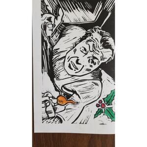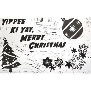 Set of 6 holiday cards depicting a linocut print inspired by Bruce Willis in Die Hard (Yes, it IS a Christmas movie!). Original was multi-color linocut art, now made into quality cards.