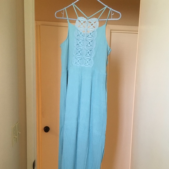 This spaghetti strap maxi dress is lined to the knee. Side zipper. Crocheted detail on the front and back of the top. Worn a few times