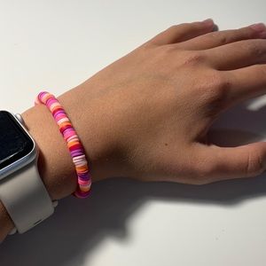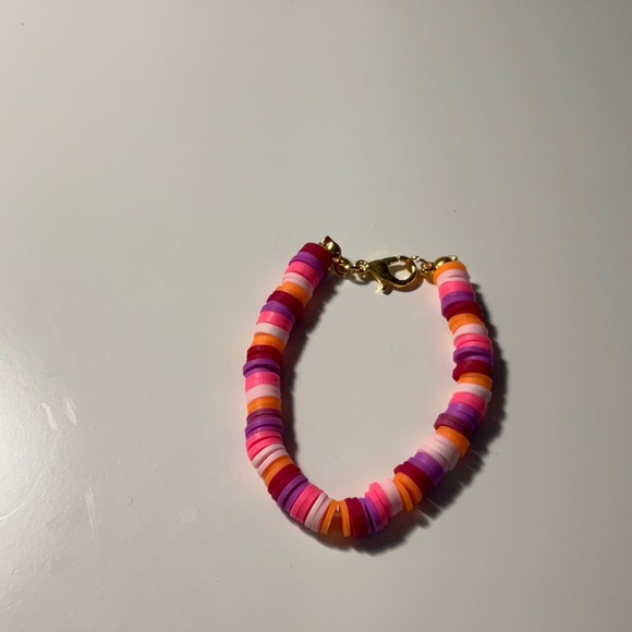 This bracletet is magenta, purple with dark pinknand light pink throughout with a little orange.