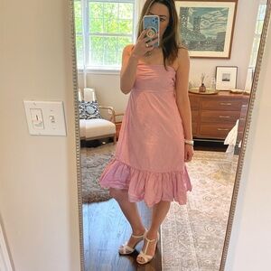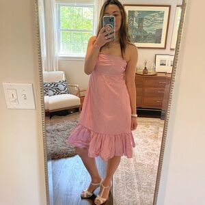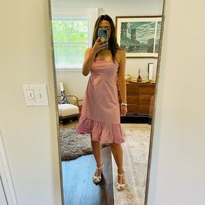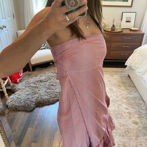 Diega Paris Wrap dress. Red on white small stripes, crisp cotton material. Ruffle at the bottom. Made in Morocco. Size small.