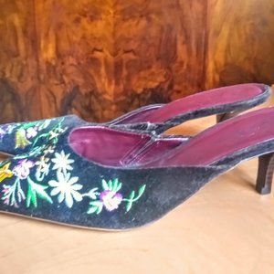 Worn 1X indoors velvet mule with floral embroidery, leather lined, leather sole.
