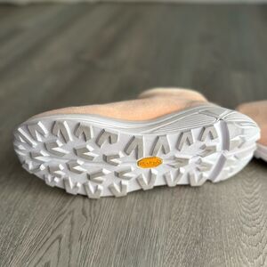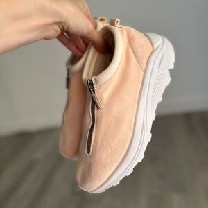 Deerskin suede slip-on sneakers in cloud pink. Round toe. Offset zip closure at vamp. Padded collar. Pull-loop at heel collar. Treaded light pink Vibram rubber sole. Silver-tone hardware. Tonal stitching.