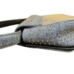 Small 1DR crystal-embellished bag from DIESEL featuring blue, cotton, leather, denim, logo plaque, crystal embellishment, single circular top handle, adjustable detachable shoulder strap, fold over top with magnetic fastening and main compartment.