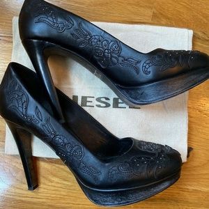 Diesel Black Leather Platform Flower Stud Studded Heels Pumps.