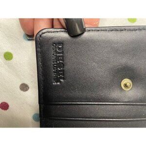 A sleek and functional Diesel trifold wallet crafted from genuine black leather with subtle textured finish. Features a gold-tone Diesel logo on the front, zippered coin pocket on the back, and a spacious interior with multiple card slots, ID window, and bill compartments. Compact yet practical, this wallet combines Diesel’s edgy style with everyday utility. Gently preloved with minor wear but overall in very good condition.