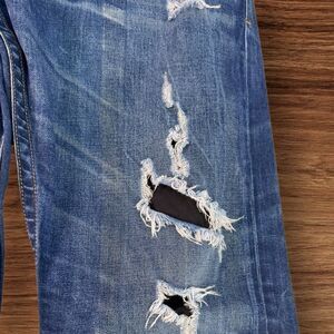 31 x 32. Distressed look, slim tapered. No stretch - 100% cotton. No holes or tears (other than distressed look).