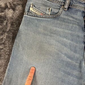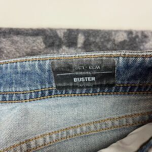 Diesel Buster Blue Denim Jeans Tapered Button Fly Men's 33X32 (35X31) Whisker. **Minor discoloration spot on front of jeans as shown in photos; no other flaws noted. Refer to all photos for condition and sizing.