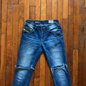 Medium Wash Faded Distressed Ripped Knee Body by Design to Continue to Distress and Wear as Jeans Age.