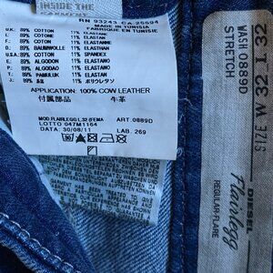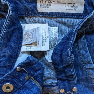 These are Diesel Flairlegg Jeans in the blue wash 0889D. They are in excellent condition. They are a size 32 waist and 32 inseam, and the last two images show measurements. Wide flare leg, front slash pockets, back patch pockets, raw frayed hems, zip fly with hook&bar and button-tab closure. Stretchy denim fabric made of 89% cotton and 11% elastane, with fading and whiskering details.