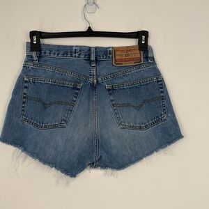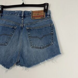 Diesel high rise buttonfly denim/jean shorts. Frayed hems. Size 30. In good preowned condition. No stains. 100% cotton. The inside tag is unreadable. Waist measures 28 inches. Rise 11 inches. Inseam 3 inches. Comes from a smoke free home.