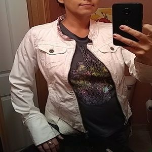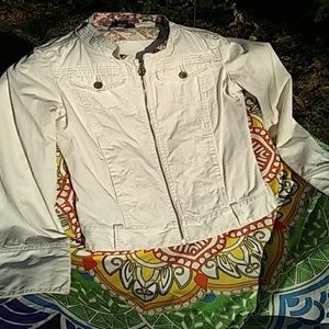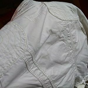 I think I wore this twice. It's in perfect condition with the exception of some tiny marks here and there since it is a solid white color. This jacket is 100% cotton. It has a detachable belt which I prefer the way the jacket looks without the belt. This jacket is perfect for a cool fall or spring evening when you need that hip edge. Burgundy print inside neckline. Cream stitching throughout and classy details with sleeves, pockets and shoulders. Zipper front closure. Moto jacket like.