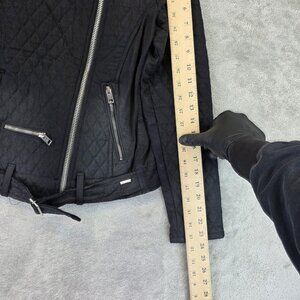 Item: Womens quilted moto biker jacket in black with asymmetrical zip front and silver-tone hardware.