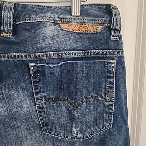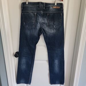 The Diesel Jeans Safado in size 34x32 are a sleek and stylish choice for men looking for a slim straight fit. These jeans feature a button fly closure and a dark wash, giving them a modern and versatile look. Made from a comfortable blend of spandex, cotton, and cotton blend, they offer stretch for added comfort and flexibility. The iconic Diesel logo accents add a touch of urban flair to the classic design, making them a must-have addition to any wardrobe. Easy to care for with machine washable instructions, these jeans are perfect for everyday wear.