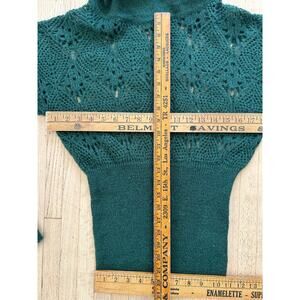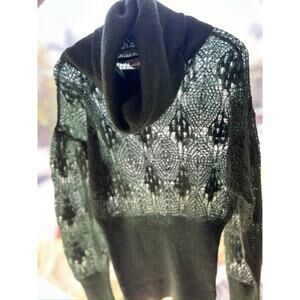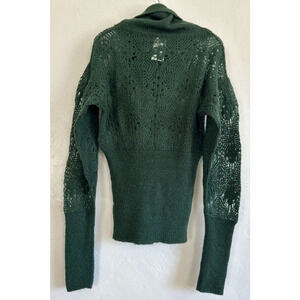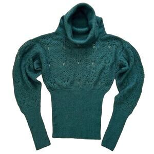 Add designer whimsy to your wardrobe with this Diesel sweater. Made of a lightweight wool blend with a cowl neckline and long puff sleeves, The solid forrest green, Victorian-inspired style make this sweater versatile. The stretch knit is a regular fit in size small. Retails for $240