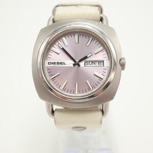 Diesel Mens 40mm Day Date Pink Silver Watch White Leather DZ5090 w New Battery