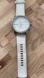 Description: White genuine leather strap, huge stainless case. Chronograph dial with white and luminous hands and markers. Just cleaned and serviced with a fresh new battery installed. Works well!