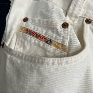 Straight style jean with button fly made of pure cotton. They have minimal detailing and a clean construction for a times less silhouette that is extremely versatile and easy to wear. Crafted in Italy from comfort denim. They show a slight color transfer from the leather logo patch. Minimal wear. In great vintage condition.