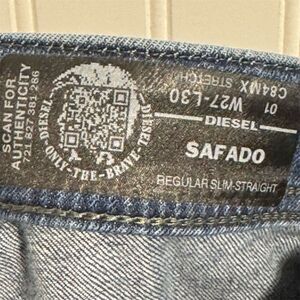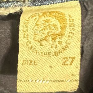 Authentic Diesel Safado men’s jeans in size W27. Features slim straight leg, distressed details, fading, and whiskering throughout. Mid-rise fit with classic 5-pocket design and Diesel patch at back waist. High-quality denim made in Italy known for its durability and iconic styling.
