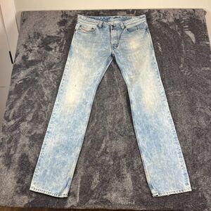 Diesel Safado Straight Acid Wash Blue Denim Jeans Button Fly Men's 33X32 Stretch. **Minor stain on front of jeans and a distressed area as shown in photos; no other flaws noted.