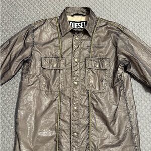 Eye-catching Diesel jacket with a metallic sheen. Lightweight for fall and spring. Features front pockets and semi-hidden designs between layers.